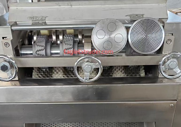 Through changing the extruding mould and the sheeted cut rollers, can produce different shapes chips.