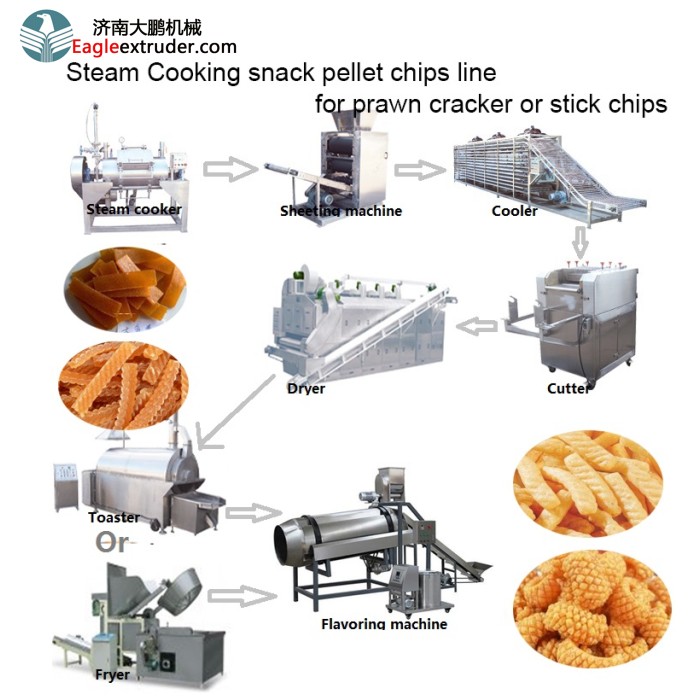 The steam cooking type prawn stick and potato chips machine is designed for efficient production of prawn sticks and potato chips using steam as the primary cooking method. It ensures even cooking, retaining the natural flavor and texture of the products. Key features include: