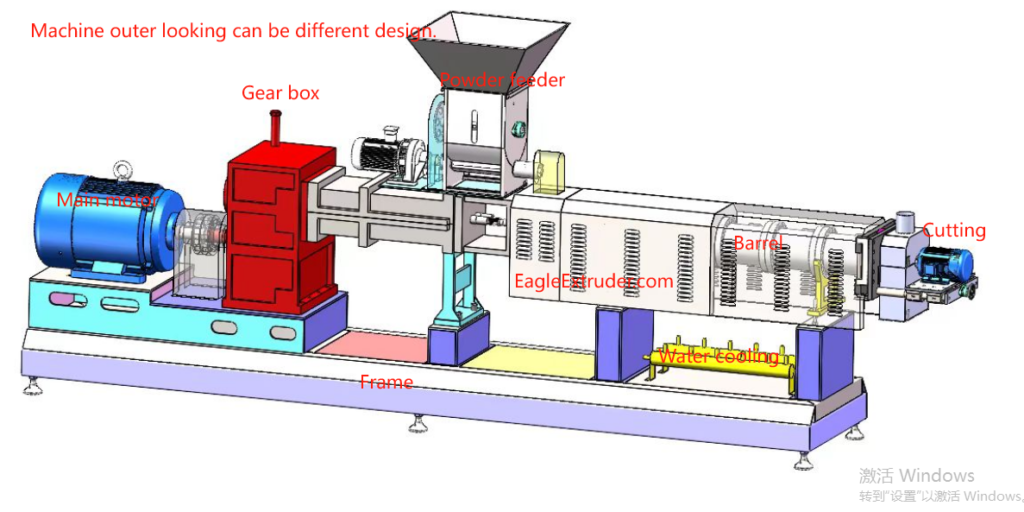 1. Twin screw extruder are consisting of feeding system, extruding system, cutting system, heating system, and Gearing system and controlling system.